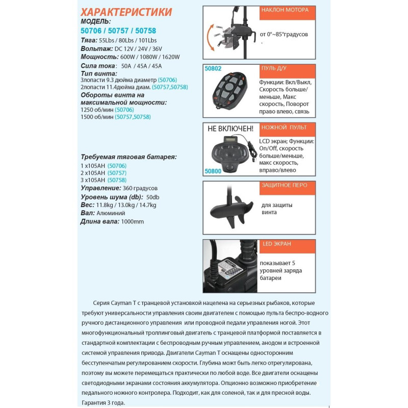 50706 Электромотор Haswing Cayman T 55Lbs черный 12ВСерия Cayman T с транцевой усновкой нацелена на серьезных рыбаков, которые требуют универсальности управления своим двигателем с помощью пульта беспроводного ручного дистанционного управления или проводной педали управления ногой. Этот многофункциональный троллинговый двигатель с транцевой платформой поставляется в стандартной комплектации с беспроводным ручным управлением, анодом и встроенной системой управления привода. Двигатели Cayman T оснащены односторонним бесступенчатым регулированием скорости. Высота глубины может быть легко отрегулирована, поэтому вы можете перемещаться практически по любой воде. Все двигатели оснащены светодиодными экранами состояния аккумулятора. Опционно возможно приобретение педального ножного контролера. Подходит как для соленой так и для пресной воды. Гарантия 2 года.