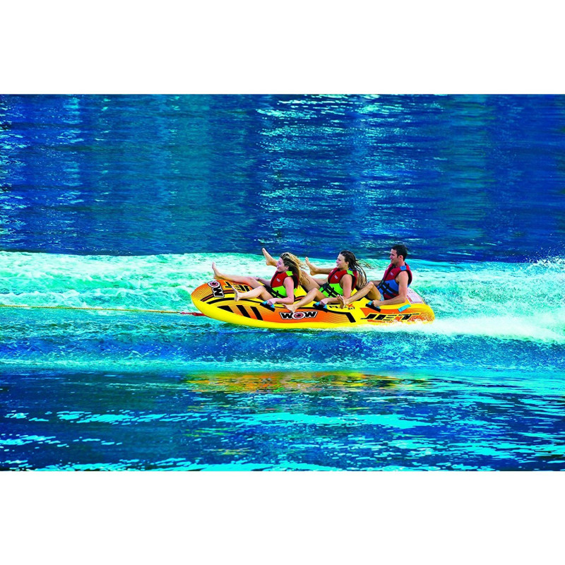 Буксируемый баллон (Плюшка) JET ВОАТ 3 PERSONSкод товара 17-1030Jet Boat 3 PersonСерия Jet Boat от WOW — это серьезное обновление старого дизайна. Буксируемая как торпеда или как хот-дог серия существует уже много лет, но проблема с этими предметами всегда заключалась в том, что ездоки не могли очень легко выбраться после падения и опрокидывались на поворотах из-за своего высокого центра тяжести. Компания WOW исправила эти проблемы с помощью новой системы сидений Flex-Form,. Сидения Flex-Form позволяют водителям садиться в буксир, а не сверху. Это понижает центр тяжести предмета и сохраняет его быстрым и устойчивым на волнах и на поворотах. Эта добавленная стабильность отлично подходит для тех, кто хочет ехать быстро, а также для тех, кто хочет более безопасной и менее насыщенной поездки. Сидения Flex-Form сконструированы из нейлоновых ремней, а также из 4-стороннего эластичного материала, стойкого к ультрафиолетовому излучению, для дополнительного комфорта. Особенности: 1-3 райдера. Безопасная форма кабины. Максимальный вес всех 231 кг.Усиленная передняя точка буксировки с буксируемым разъемом EZ для буксировки троса EZПониженный центр тяжести удерживает седоков на поворотах и волнахОтличное семейное развлечение для маленьких детей и взрослых, которые хотят сидеть в седле для более безопасной езды6 двойных ручек из пеныпластика и 2 плоских ручкиПолный нейлоновый чехол с прочной надежной молниейУсиленные баллоны из ПВХКрышка клапана на молнииСкоростной клапан для быстрой инфляции и дефляцииРазмер в накачанном состоянии 302 см х 95 см х 39 см1 год гарантии