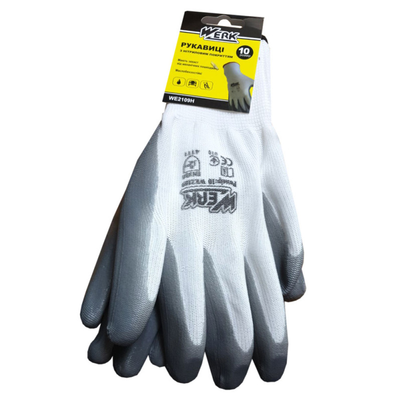 (WE2109H) Рукавички поліестер бiлi, з сірим нітриловим покриттям р.10 WERKз підв.