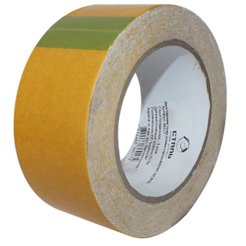 Сталь 36017 Скотч двухсторонний на тканевой основе 50мм х 25м Двухсторонний скотч состоит из тканевой основы, на которую с двух сторон нанесен клейкий слой из синтетического каучука.