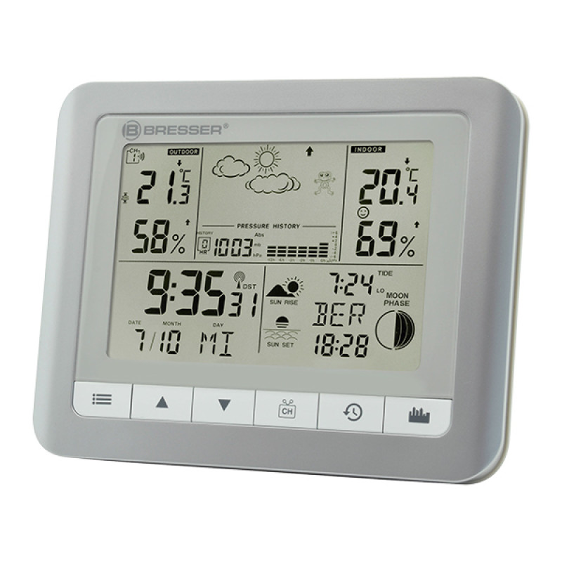 Метеостанция Bresser TemeoTrend WFS Silver фиксирует изменения барометрического давления и на основании этих изменений выводит на дисплей краткосрочный прогноз погоды на ближайшее время. Также измеряет величину атмосферного давления, температуру и влажность в помещении и на улице.