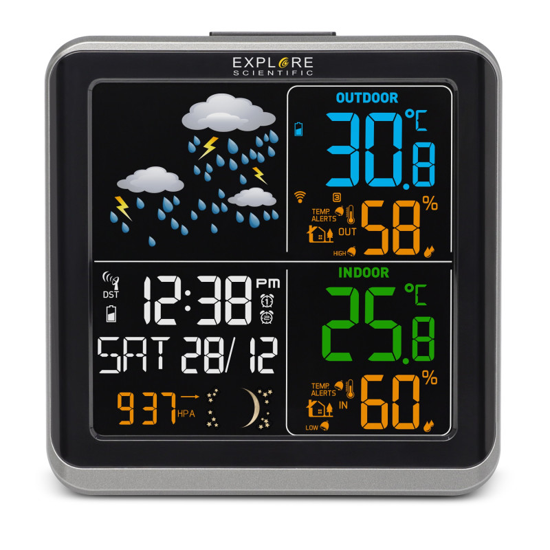 Современная метеостанция с цветным дисплеем Explore Scientific Color WSH4008 (WSH4008LC2000) станет отличным помощником в домашних условиях, ведь знание и контроль окружающего нас микроклимата имеет прямое отношение не только к нашему здоровью но и к здоровью наших детей. Станция отображает прогноз погоды, обеспечивает измерение таких важных метеопараметров как температура и относительная влажность воздуха. Пользователь может запрограммировать крайние температурные приделы, при выходе за которые, будет проинформирован звуковым сигналом. Станция отображает атмосферное давление, тенденции его изменения, фазы луны, даты, дня недели. Точность времени под контролем радиосигнала DCF.