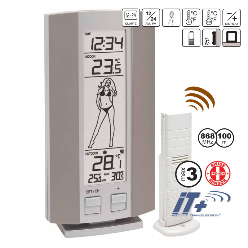 Достаточно оригинальная метеостанция Technoline WS9750 IT станет отличным и полезным подарком, в том числе и себе самому. Центральное место на дисплее занимает изображение "погодной девочки", которая меняет свое одеяние в зависимости от уличной температуры, тем самым подсказывая, как сегодня стоит одеться, выходя на улицу. Температурные показатели метеостанция считывает с беспроводного радиодатчика температуры. Отличительной особенностью является технология передачи данных, благодаря которой удалось достичь более стойкого сигнала, увеличения радиуса действия, а главное беспрерывной передачи данных, не увеличивая при этом энергопотребление. При необходимости можно приобрести и подключить еще два дополнительніх датчика. Данные по минимальной и максимальной внешней температуре отображаются на дисплее в постоянном режиме, таким образом, нет необходимости искать нужную кнопку для вывода этих данных на дисплей.