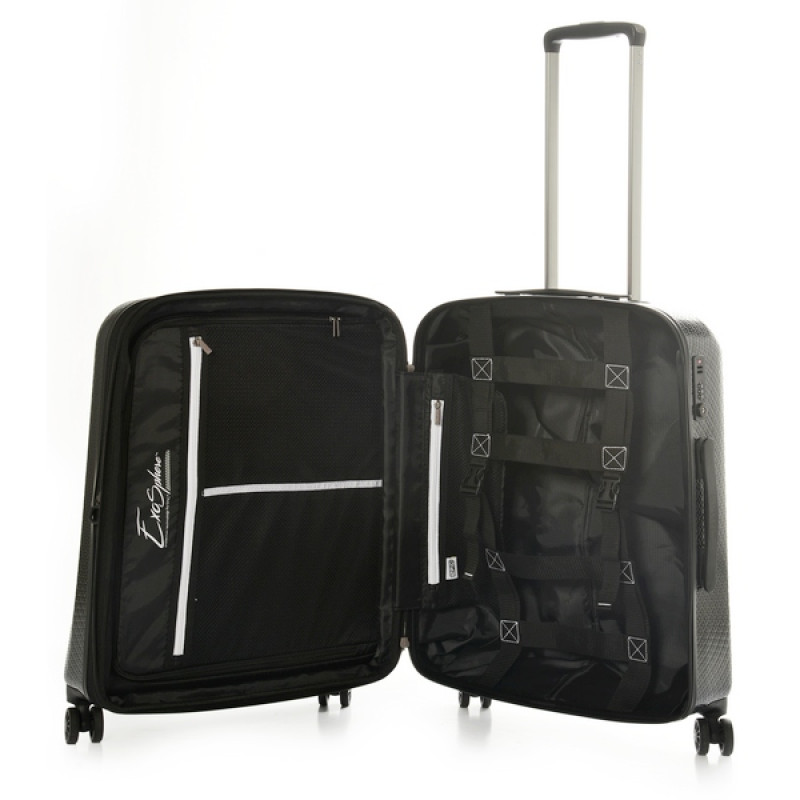 - EXOSPHERE™ - корпус чемодана изготовлен из запатентованного компанией Bayer® поликарбоната Makrolon®, который без сомнения, на сегодняшний день обладает лучшими прочностными и упругими характеристиками на рынке, являясь наиболее технологичным материалом для производства корпусов чемоданов. Благодаря высокой прочности, именно Makrolon® используется для производства стекол в авиастроении, пуленепробиваемых стекол, прозрачных куполов стадионов и др. Корпус чемодана имеет рельефную микросферическую структуру поверхности ExoSphere™, что придает оболочке шелковисто-матовый оттенок, значительную устойчивость к царапинам, и обеспечивает чемодану отличный внешний вид в течение длительного времени эксплуатации.