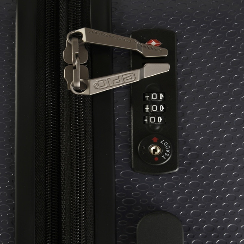 • TSA LOCK™ by TRAVEL SENTRY® - чемодан оборудован специальным кодовым замком с функцией таможенного досмотра TSA LOCK™. Не смотря на то, что современные технологии позволяют таможенным службам аэропортов проводить досмотр чемоданов с помощью специальных сканеров, иногда возникает необходимость вскрыть чемодан для более детальной проверки. Администрация транспортной безопасности США (Transportation Security Administration) совместно с компанией Travel Sentry разработала кодовые замки, которые могут быть открыты только специальными ключами, за которые сотрудники безопасности аэропортов несут персональную ответственность. Таким образом, при физическом досмотре и вскрытии багажа, замки и молнии останутся целы, и секретный код замка также будет сохранен. Сегодня множество служб безопасности аэропортов по всему миру одобрили и используют ключи системы TSA LOCK™ для досмотра багажа. Полный список стран и производителей багажа, официально использующих замки TSA LOCK можно посмотреть на сайте производителя Travel Sentry. Чемоданы EPIC, отмеченные логотипом Travel Sentry, оснащены замками системы TSA LOCK™ и соответствуют стандартам глобальной безопасности путешествий.