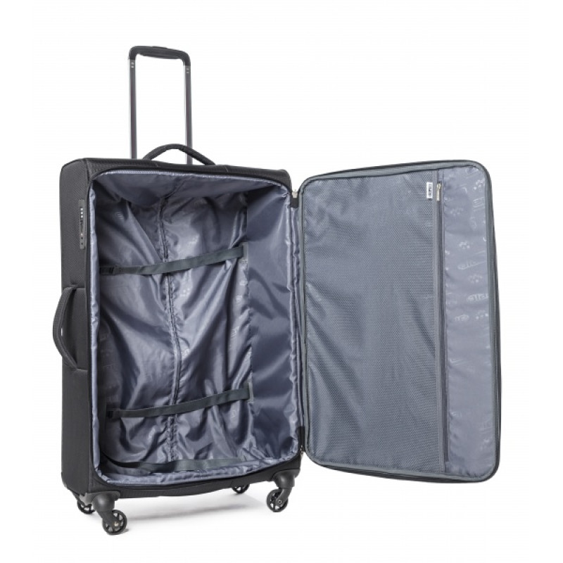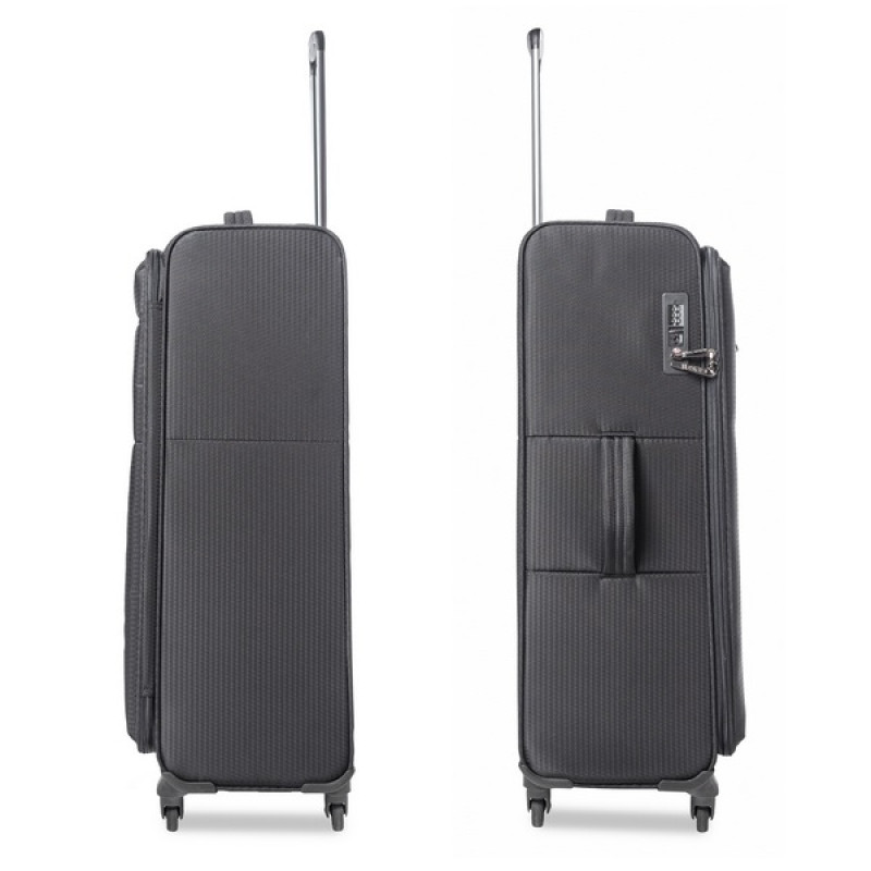 - SOFT SHELL POLYESTER 500D - ткань из полиэстера с толщиной нити 500D, имеющая объемный крупный узор, создающий внешнюю игру света, и с внутреннее полиуретановое покрытие, защищающее содержимое чемодана от намокания во время дождя средней интенсивности. Также ткань обладает хорошей износостойкостью, и не разрушается под действием ультрафиолетового излучения.