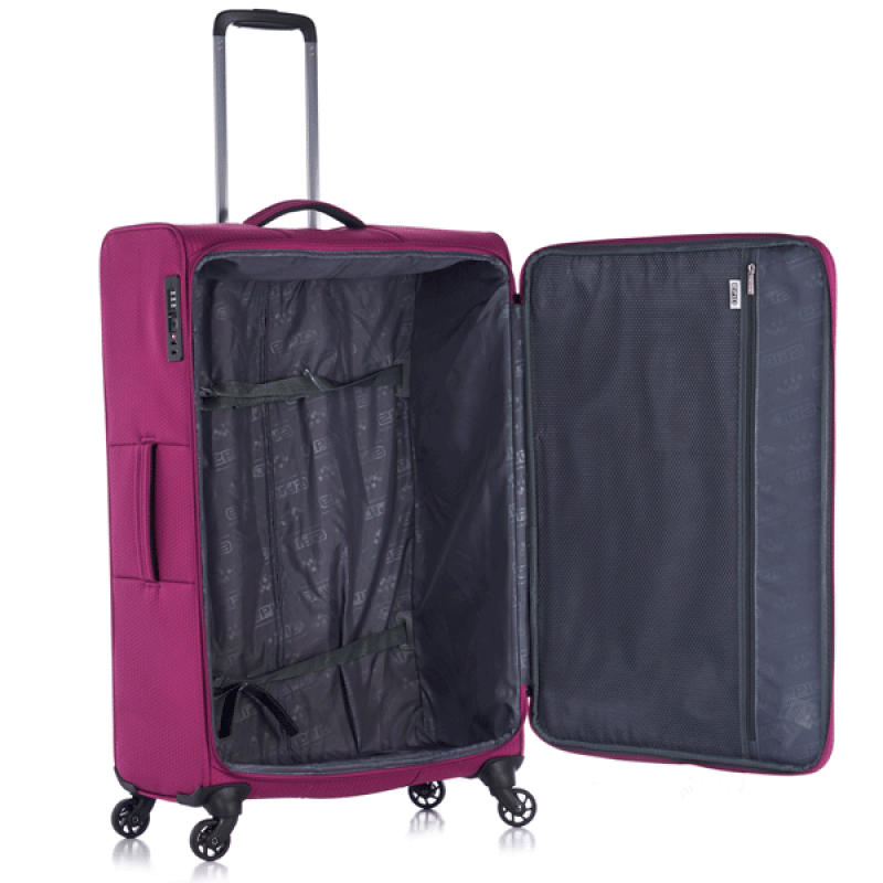 - SOFT SHELL POLYESTER 500D - ткань из полиэстера с толщиной нити 500D, имеющая объемный крупный узор, создающий внешнюю игру света, и с внутреннее полиуретановое покрытие, защищающее содержимое чемодана от намокания во время дождя средней интенсивности. Также ткань обладает хорошей износостойкостью, и не разрушается под действием ультрафиолетового излучения.