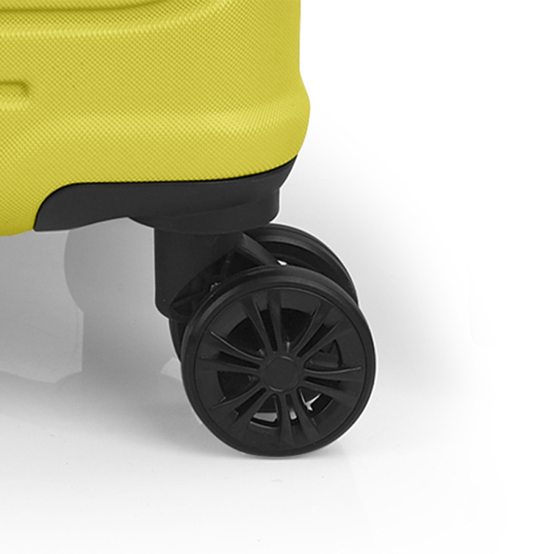 Чемодан оснащен четырьмя полноповоротными колесами с возможностью независимого разворота каждого колеса на 360 °. Системой предусмотрено равномерное перераспределения нагрузки на каждое колесо, что в свою очередь способствует плавному качению и маневренности чемодана, прилагая при этом минимум усилий. Колеса изготовлены из высокотемпературного термопластичного полиуретана (TPU). Материал обладает прочностью сравнимой с пластиком, гибкостью силикона, а так же имеет повышенную устойчивость к перепадам температур. Отличительной особенностью колес из TPU материала является снижение шума до минимума при качении чемодана по неровной поверхности. Благодаря устойчивости к истиранию материал колес отличается длительным сроком эксплуатации.