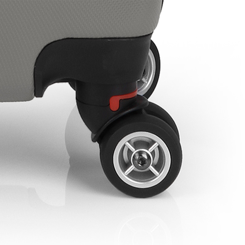 Чемодан оснащен четырьмя полноповоротными, спаренными колесами с возможностью независимого разворота каждого колеса на 360 °. Системой предусмотрено равномерное перераспределения нагрузки на каждое колесо, что в свою очередь способствует плавному качению и маневренности чемодана, прилагая при этом минимум усилий.