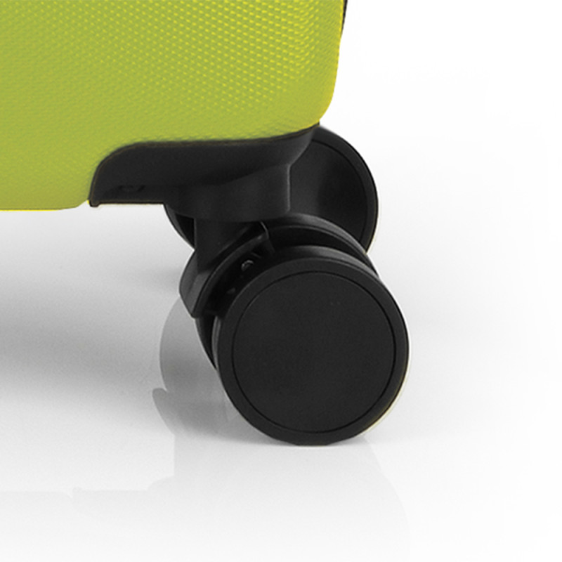 Чемодан оснащен четырьмя полноповоротными, спаренными колесами с возможностью независимого разворота каждого колеса на 360 °. Системой предусмотрено равномерное перераспределения нагрузки на каждое колесо, что в свою очередь способствует плавному качению и маневренности чемодана, прилагая при этом минимум усилий. Колеса изготовлены из высокотемпературного термопластичного полиуретана (TPU). Материал обладает прочностью сравнимой с пластиком, гибкостью силикона, а так же имеет повышенную устойчивость к перепадам температур. Отличительной особенностью колес из TPU материала является снижение шума до минимума при качении чемодана по неровной поверхности. Благодаря устойчивости к истиранию материал колес отличается длительным сроком эксплуатации.