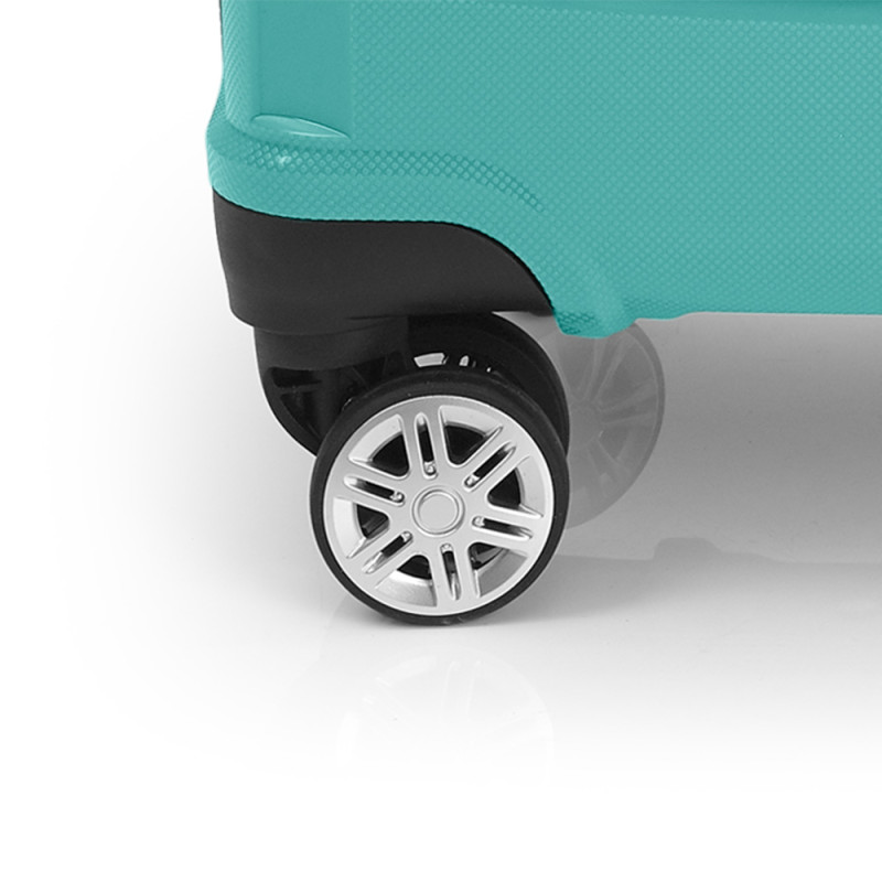 Чемодан оснащен четырьмя полноповоротными, спаренными колесами с возможностью независимого разворота каждого колеса на 360 °. Системой предусмотрено равномерное перераспределения нагрузки на каждое колесо, что в свою очередь способствует плавному качению и маневренности чемодана, прилагая при этом минимум усилий. Колеса изготовлены из высокотемпературного термопластичного полиуретана (TPU). Материал обладает прочностью сравнимой с пластиком, гибкостью силикона, а так же имеет повышенную устойчивость к перепадам температур. Отличительной особенностью колес из TPU материала является снижение шума до минимума при качении чемодана по неровной поверхности. Благодаря устойчивости к истиранию материал колес отличается длительным сроком эксплуатации.