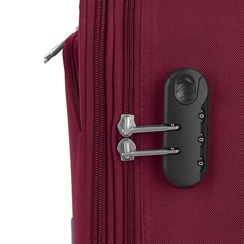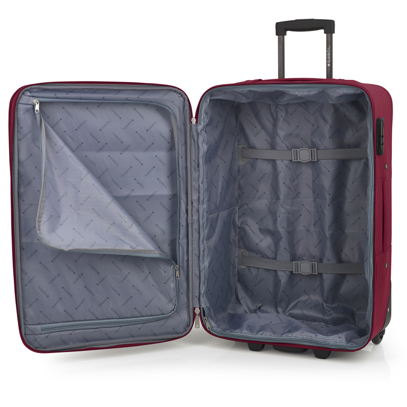 - Чемодан разделен перегородкой на молнии на два основных отделения.