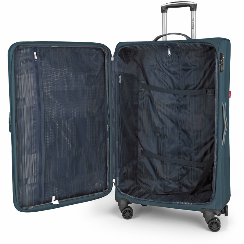 Чемодан Gabol серии Zambia оснащен кодовым замком системы TSA для повышения безопасности. Каркас дна легкий и прочный благодаря сотовой структуре строения. На фасадной части размещены вместительный кармана на молнии. Внутренний объем имеет ремни для фиксации вещей внутри.  Чемодан легкий, маневренный и удобный для транспортировки.