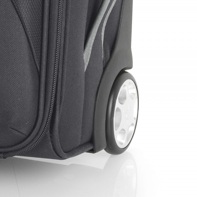 Чемодан оснащен парой роликовых колес из высокотемпературного термопластичного полиуретана (TPU). Материал обладает прочностью сравнимой с пластиком, гибкостью силикона, а так же имеет повышенную устойчивость к перепадам температур. Отличительной особенностью колес из TPU материала является снижение шума до минимума при качении чемодана по неровной поверхности. Благодаря устойчивости к истиранию материал колес отличается длительным сроком эксплуатации.