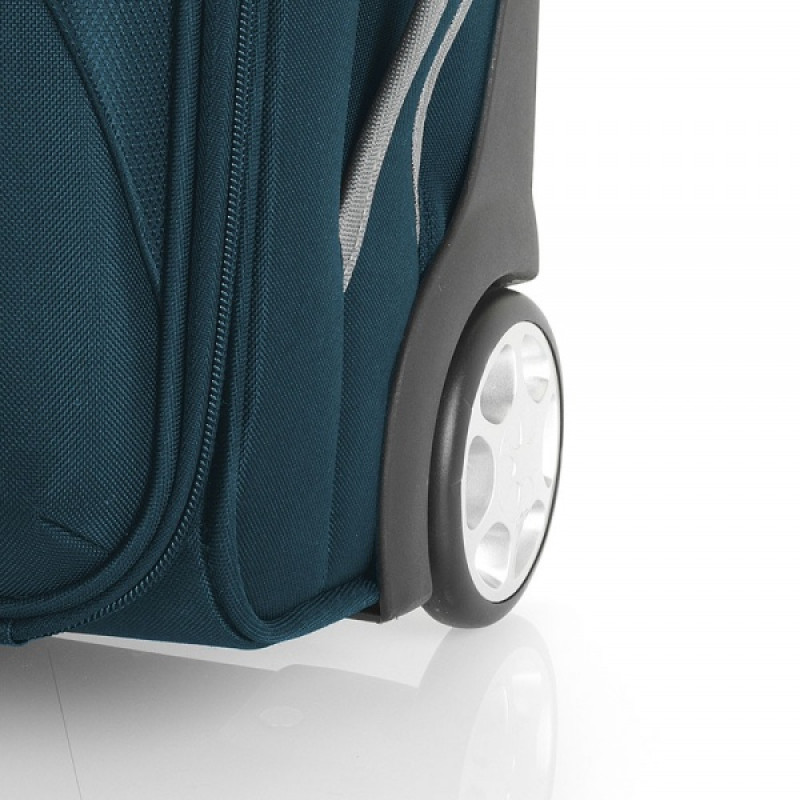 Чемодан оснащен парой роликовых колес из высокотемпературного термопластичного полиуретана (TPU). Материал обладает прочностью сравнимой с пластиком, гибкостью силикона, а так же имеет повышенную устойчивость к перепадам температур. Отличительной особенностью колес из TPU материала является снижение шума до минимума при качении чемодана по неровной поверхности. Благодаря устойчивости к истиранию материал колес отличается длительным сроком эксплуатации.