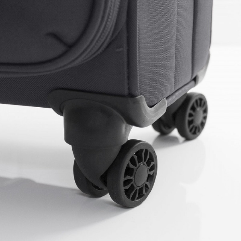 Чемодан оснащен четырьмя спаренными роликовыми колесами из высокотемпературного термопластичного полиуретана (TPU). Материал обладает прочностью сравнимой с пластиком, гибкостью силикона, а так же имеет повышенную устойчивость к перепадам температур. Отличительной особенностью колес из TPU материала является снижение шума до минимума при качении чемодана по неровной поверхности. Благодаря устойчивости к истиранию материал колес отличается длительным сроком эксплуатации.