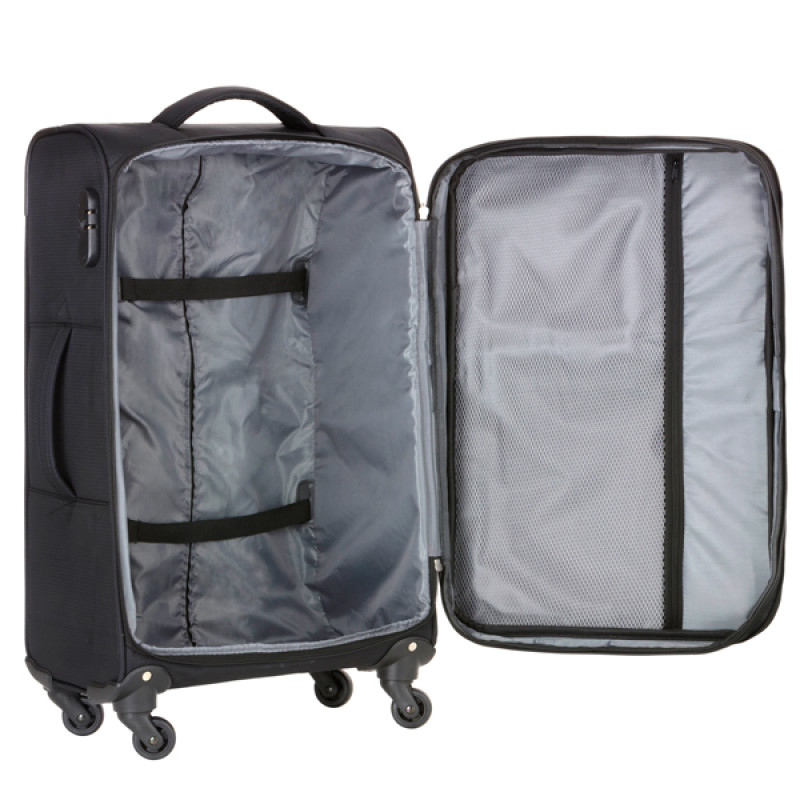 Эргономичная система выдвижной телескопической ручки с кнопочным фиксатором позволяет отрегулировать высоту выдвижной ручки для дополнительного удобства и комфорта пользователя. Внутренний объем разделен перегородкой на два отделения и имеет ремни для фиксации вещей и дополнительные карманы.