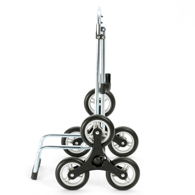 - Стальная тележка Treppensteiger Scala оснащена шестиколесной системой с колесами диаметром 13 см и обладает грузоподъемностью 40 кг. Благодаря простой системе крепления, колеса можно легко снять и помыть. Все, что Вам нужно сделать, это нажать на металлический фиксатор на колесе. Колеса подходят для легкого преодоления ступенек.