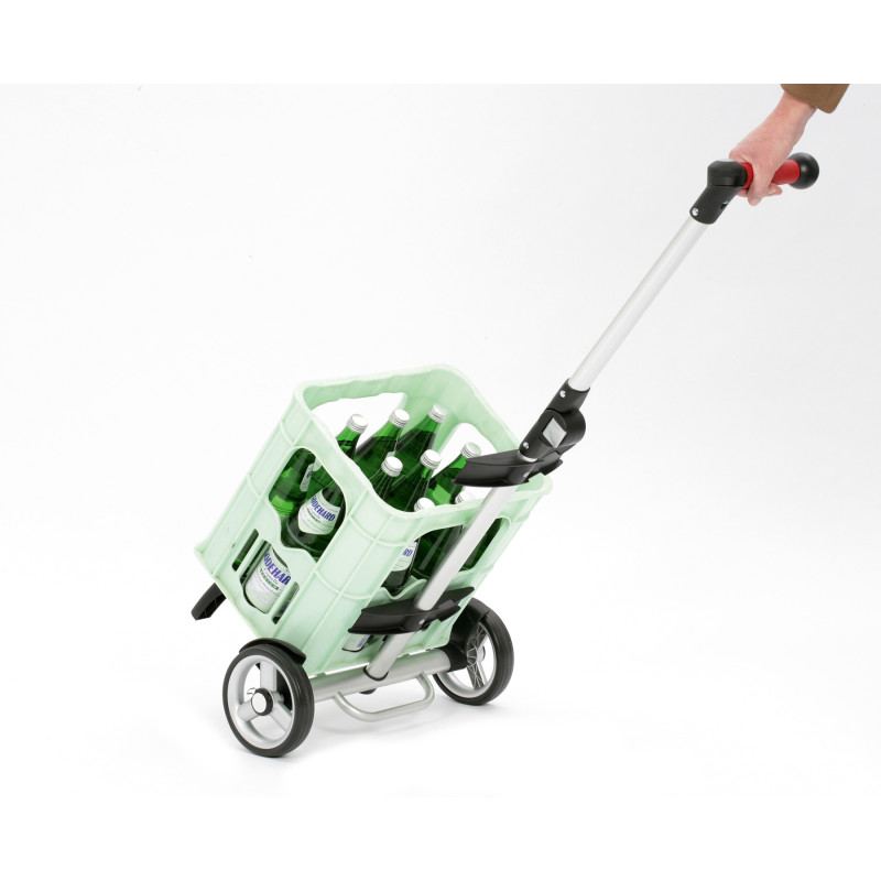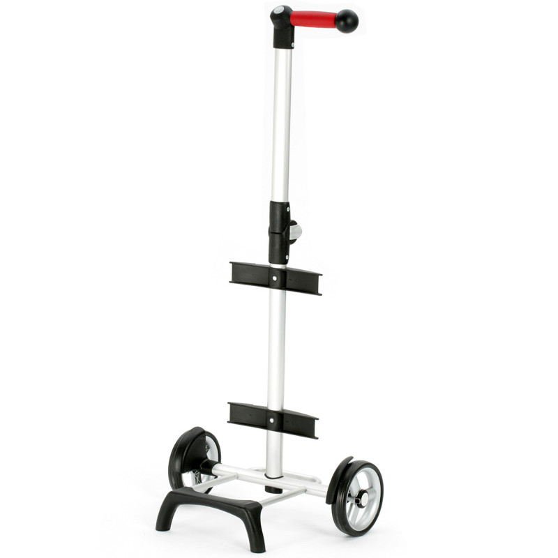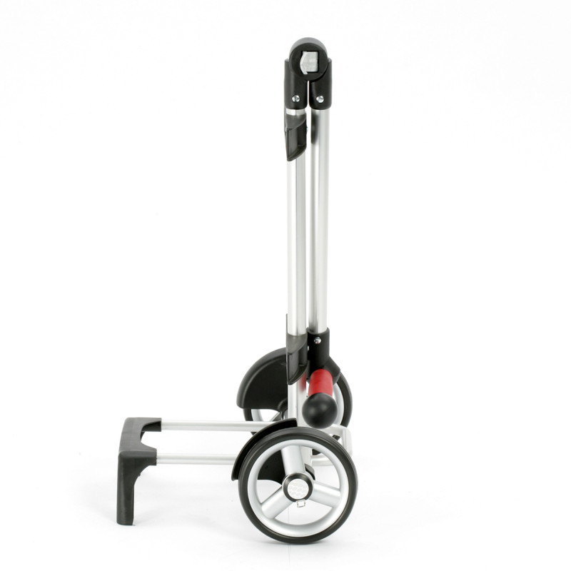 - Тележка оснащена телескопической ручкой, что позволяет вдвое уменьшить высоту конструкции и фиксировать ручку на любую высоту.