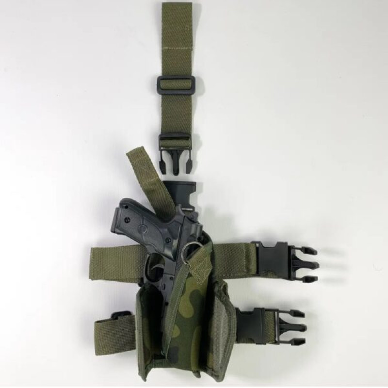 Кобура для переноски пистолета ПМ и магазинов.Кобура на бедро состоит из прочной платформы с MOLLE-совместимыми лентами и фиксационной ременной ленты.Ткань прочная и надежная, дополнительно усилена от разрывов и стирания.Небольшая кобура надежно фиксирует пистолет благодаря застежке-бабочке на широкой липучке.Имеет дополнительный регулятор объема с фиксатором-липучкой.Крепится на бедро двумя ременными лентами с пряжками и пластиковыми фастексами.При необходимости ленты можно отстегнуть и цеплять кобуру только за ремень или другое снаряжение. Характеристики:Ткань – Оксфорд 600D;Цвет – оливковый;Вес – 215 г.