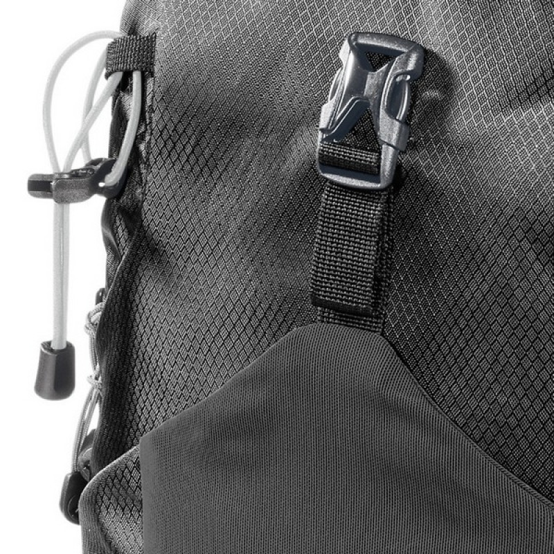 Trekking poles holder (1) - держатели для треккинговых палок размещаются в верхней и нижней части фасада треккингового рюкзака и, как правило, представляют собой комбинацию нижних петель и верхних стяжных эластичных шнуров с фиксатором. Реже нижние петли заменяются такими же стяжными шнурами. Такие держатели позволяют надежно фиксировать треккинговые палки и не загружать ими внутреннее пространство рюкзака. Данный рюкзак имеет одну пару креплений для одной или двух треккинговых палок.