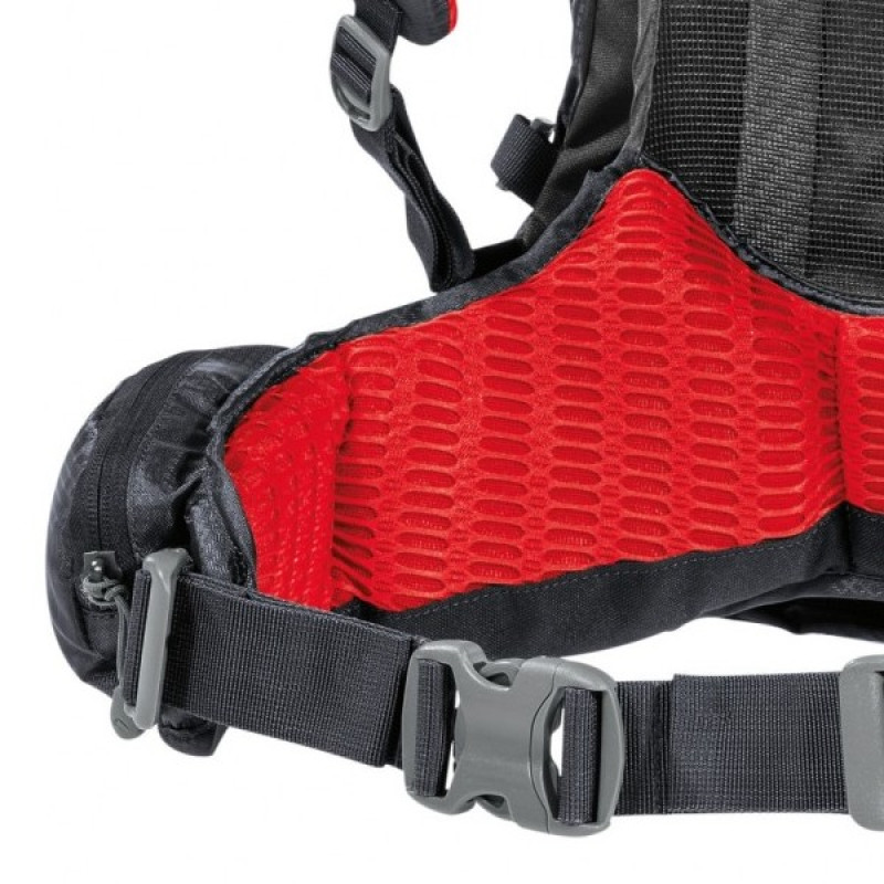 - Плечевые шлейки: регулируемые по высоте, анатомической формы с мягкой пенополиуретановой подкладкой, обшиты дышащей сетчатой тканью, с петлями для фиксации патрубка питьевой системы