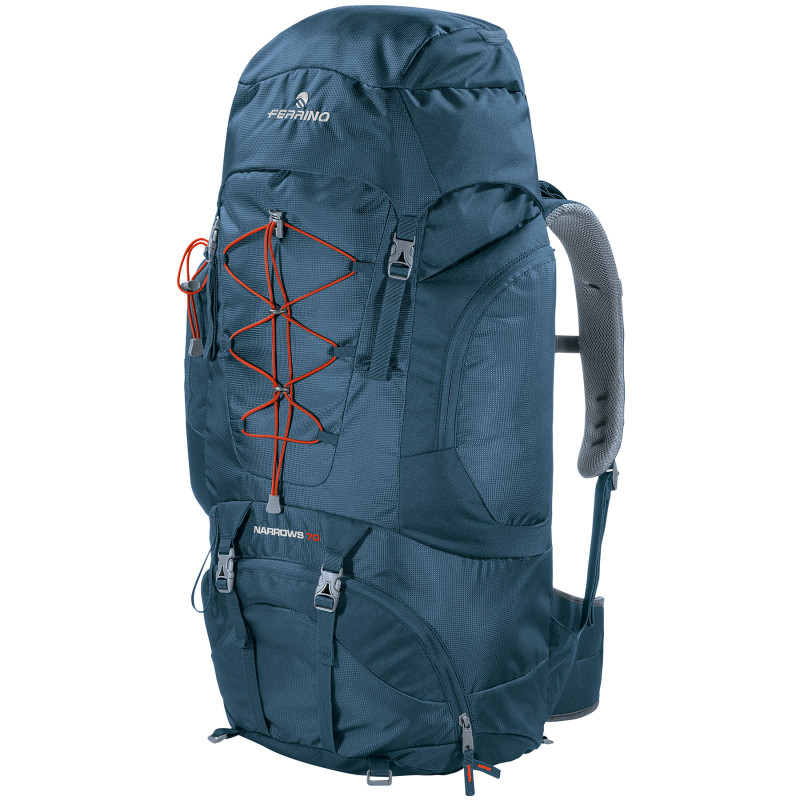 Серия треккинговых рюкзаков Ferrino Narrows является дальнейшим усовершенствованием популярной и недорогой серии Esterel и нацелена на предоставление наибольшего объема всех отделений, благодаря чему в данный рюкзак удобно упаковывать действительно объемные вещи. Необычная компоновка прослеживается в разделении основного отделения на два практически равных отсека. Верхний отсек варьируется вытяжным клапаном и не имеет различного рода карманов, крадущих пространство основного объема. Фронтальный вход ведет в нижний большой отсек рюкзака. Тут без проблем вмещается достаточно большой трехсезонный спальник или пара зимних треккинговых ботинок. Боковые карманы также просторны и свободно вмещают флягу объемом полтора литра. Пара карманов в клапане на молнии с карабином для ключей так же очень вместительные. А на фронтальной панели размещается эластичная стяжка для крепления таких объемных вещей, как куртка или кофта. При необходимости пристегнуть дополнительное снаряжение, можно использовать пару нижних компрессионных стяжек, либо дополнительные стропы, которыми укомплектован рюкзак. Подвесная система достаточно уникальна, проста, но эффективно справляется со своим назначением, разгружая позвоночник, обеспечивая доступ воздуха к спине и надежно фиксируя рюкзак во время ходьбы. На фасаде рюкзака имеются крепления для треккинговых палок или ледоруба.