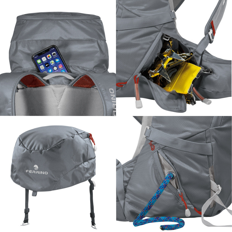 Compatible H2O Bag - данный рюкзак совместим, и может быть оснащен фирменной гидратационной системой Ferrino емкостью два литра, или любой другой питьевой системой соответствующего литража. Рюкзак имеет необходимое отделение для размещения и петлю для крепления питьевой системы, а также все необходимые отверстия и зажимы для фиксации питьевого патрубка. Shoulder Strap Whistle - на одной из плечевых шлеек рюкзака размещается съемный пластиковый свисток. Свисток позволяет подавать опознавательные сигналы для определения местонахождения, а также подавать звуковые S.O.S. В экстремальных условиях не всегда хватает силы голоса. чтоб подать сигнал необходимой громкости, а свисток, что очень удобно, всегда находится под рукой.
