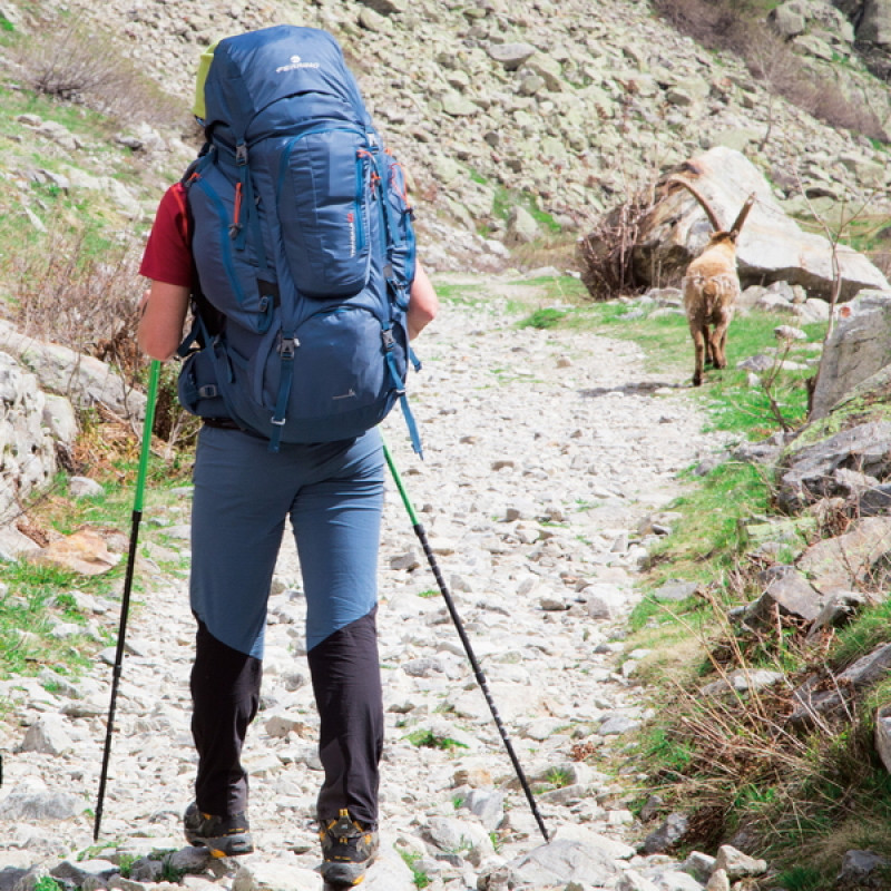 Серия экспедиционных рюкзаков Ferrino Transalp отличается большим объемом и рядом конструкционных решений повышающих удобство и надежность рюкзака для большого количества снаряжения. Подвесная система с бесступенчатой регулировкой имеет двойную фиксацию, набедренный пояс широкий с увеличенной толщиной пенополиуретановой подкладки для большего комфорта при максимальной загрузке. В двух точках с наибольшей нагрузкой рюкзак усилен вставками из прочного материала Hypalon®. Боковые стропы смещены к центру и удлинены, позволяя зафиксировать более объемную палатку. Дополнительное снаряжение можно крепить с помощью пары нижних стяжки и отдельных строп, поставляемых в комплекте. Для палок и ледорубов имеется пара отдельных креплений. Вещи первой необходимости можно разместить в девяти карманах различного объема (два на фасаде, два по бокам, три в клапане и два на поясе). При полной загрузке становится крайне важным наличие двух фронтальных входов, облегчающих упаковку и распаковку необходимых вещей. Внутри рюкзак очень просторный, нижний отсек отделен перегородкой, туда без проблем помещается объемный зимний спальник. Объем верхнего отсека может варьироваться с помощью вытяжного клапана. Рюкзак полностью адаптирован под питьевую систему. В нижнем потайном кармане размещен объемный защитный чехол от дождя.