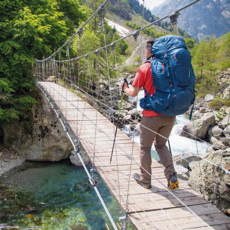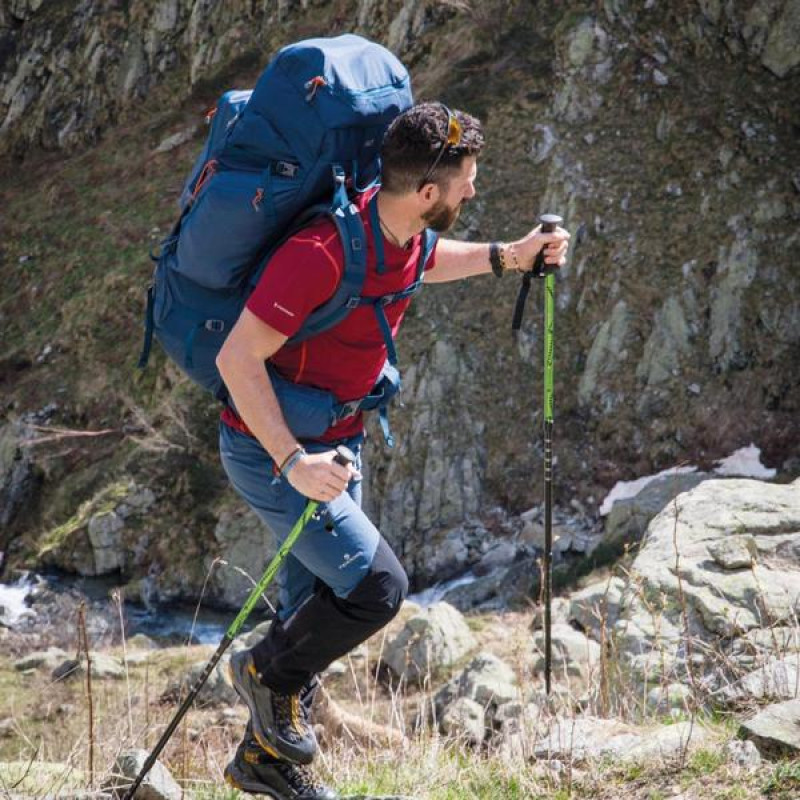 Серия экспедиционных рюкзаков Ferrino Transalp отличается большим объемом и рядом конструкционных решений повышающих удобство и надежность рюкзака для большого количества снаряжения. Подвесная система с бесступенчатой регулировкой имеет двойную фиксацию, набедренный пояс широкий с увеличенной толщиной пенополиуретановой подкладки для большего комфорта при максимальной загрузке. В двух точках с наибольшей нагрузкой рюкзак усилен вставками из прочного материала Hypalon®. Боковые стропы смещены к центру и удлинены, позволяя зафиксировать более объемную палатку. Дополнительное снаряжение можно крепить с помощью пары нижних стяжки и отдельных строп, поставляемых в комплекте. Для палок и ледорубов имеется пара отдельных креплений. Вещи первой необходимости можно разместить в девяти карманах различного объема (два на фасаде, два по бокам, три в клапане и два на поясе). При полной загрузке становится крайне важным наличие двух фронтальных входов, облегчающих упаковку и распаковку необходимых вещей. Внутри рюкзак очень просторный, нижний отсек отделен перегородкой, туда без проблем помещается объемный зимний спальник. Объем верхнего отсека может варьироваться с помощью вытяжного клапана. Рюкзак полностью адаптирован под питьевую систему. В нижнем потайном кармане размещен объемный защитный чехол от дождя.