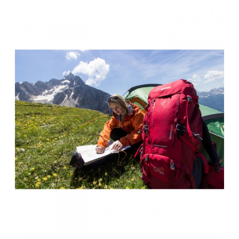 Фирменная подвесная система Self Adjust (SA) back system позволяет быстро и правильно настроить посадку подвесной системы с учетом роста пользователя. Рюкзак оборудован под гидросистему и оснащен съемным чехлом от дождя. Пространство рюкзака разделено перегородкой на верхнее и нижнее. В нижнюю часть рюкзака удобно паковать обувь, спальный мешок и др. На фасаде имеется крепления для палок или ледорубов. Боковые и нижние стяжки фиксируют дополнительное снаряжение.