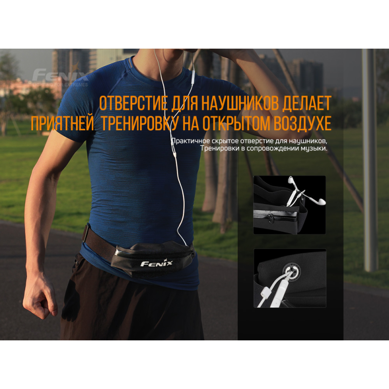 Любіть під час бігу слухати музичні композиції? Немає нічого простіше для безперервного насолоди музикою, ніж тримати при собі поясну сумку Fenix AFB-10. У новинці є практичний відсік спеціально для навушників. Ваші ранкові пробіжки стануть ще більш яскравими і насиченими. Комфорт і улюблені пісні чудово мотивують до занять фізкультурою.
