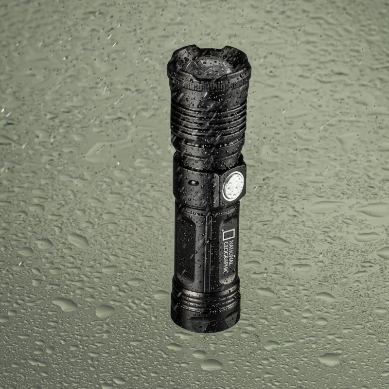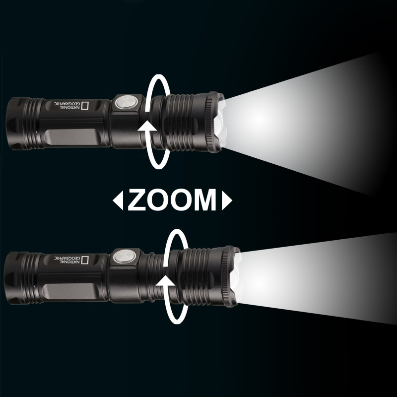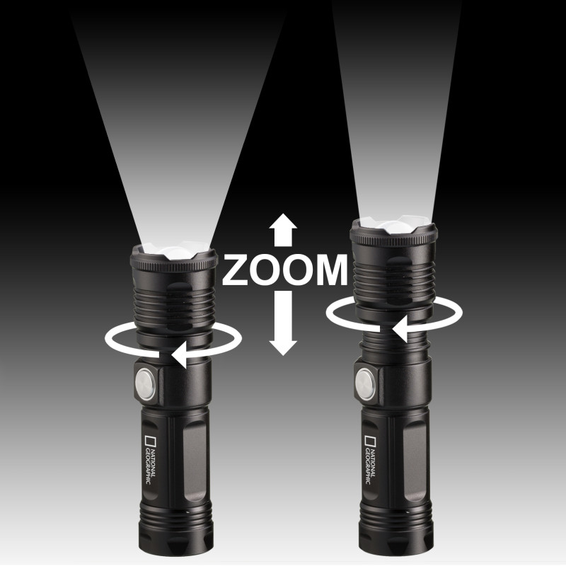 Потужний промінь у 1000 люмен, сучасний світлодіод Cree SST40, надлегка вага лише 107 грамів, герметично захищений корпус за стандартом IPX44, компактний та багатофункціональний ліхтар National Geographic Iluminos Led Zoom Flashlight 1000 lm (9082400) відмінний вибір для туристів, мисливців, рибалок, кемперів, та й просто для повсякденного використання. Ліхтар оснащений системою фокусування променю, яка дозволяє вручну регулювати відстань, на якій ліхтар буде освітлювати об'єкти, і кут променю від далекого сфокусованого пучка світла до широкого, однорідного освітлення, ширина світлового променю регулюється ковзанням головної частини корпусу ліхтаря уперед чи назад. Завдяки цьому модель здатна ефективно освітлювати місцевість на різній відстані. Надійний алюмінієвий корпус з анодованим покриттям забезпечує захист від механічних пошкоджень. Гумові ущільнювачі забезпечують герметичність корпусу за стандартом IPX44 (захист від водяних бризок з будь-якого напрямку). Завдяки вбудованому магнітоутримувачу в торцевій частині корпусу, ліхтар легко можна закріпити на будь-якій металевій поверхні, наприклад, крило або капот автомобіля. Ліхтар має 3 режими роботи: яскравість - 100%, яскравість - 50% та стробоскоп - для подачі добре помітних на великій відстані сигналів. При першому натисканні вмикається максимальна потужність, при повторному яскравість 50%, третій натиск режим стробоскопа. Ліхтар укомплектований акумулятором 16340 (Li-ion 3,7V 700 mAh), магнітний USB-кабелем для заряджання.