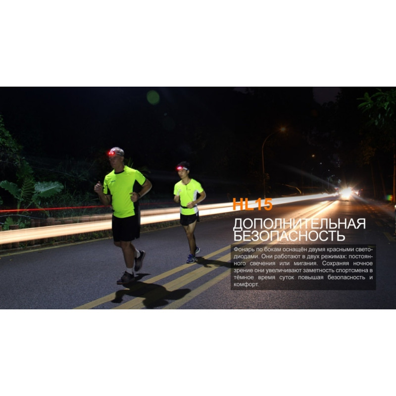 Модель Fenix HL15 відноситься до категорії налобних ліхтарів. Тому вона дуже популярна серед любителів відпочивати за містом активно: туристів, рибалок, спортсменів. В даному ліхтарі використовується одночасно два діоди, які забезпечують нейтрально-біле освітлення в чотирьох режимах і два додаткових режиму червоного світла. Це довговічні моделі діодів, які в змозі прослужити 50 тис. годин. Яскравість ліхтарі Fenix HL15 може досягати 200 люмен, якщо включити його в режимі Turbo. Інші режими білого освітлення дають 70, 30, 4 люмена яскравості. Другий діод забезпечить користувача ліхтаря двома не яскравими, але корисними режими Eco і Flash на 0,2 люмена. При таких параметрах яскравості, ліхтар буде висвітлювати територію на відстані до 50 метрів. Щоб керувати роботою Fenix HL15, на верхній площині його корпусу розташовані дві незалежні кнопки. Одна з них відповідає за роботу білого діода, а друга дозволяє вмикати червоне світло. Натискання на них можна заблокувати, використовуючи спеціальний пластиковий козирок. Це допомагає перевозити ліхтар разом з встановленими акумуляторами без ризику того, що він випадково включиться і елементи живлення повністю розрядяться. До речі, для ліхтаря Fenix HL15 можна використовувати відразу два варіанти елементів живлення. Мова йде про розмір ААА (мікро-пальчикові): нікель-металгідридні акумулятори кілька сотень разів акумулятори та лужні батарейки без можливості повторної зарядки. Використовувати інші варіанти елементів живлення заборонено, оскільки вони не підійдуть по потужності. Ремінець на голову для моделі Fenix HL15 зроблений еластичним, з можливістю регулювати розмір. Крім того, на ньому є особливі вставки, що відбивають світло, а щільна посадка цього ремінця допомагає захистити очі від попадання в них поту під час бігом або інших занять, що вимагають інтенсивного навантаження. Корпус ліхтаря комбінує деталі з алюмінію і різновиди міцного пластику. Він забезпечує високу механічну міцність, а також захист від бруду та води (стандарт IP-67). Для зручності користувача, корпус ліхтаря можна нахилити вперед на кут 60°. Особливості:- використовуються довговічні діоди білого і червоного кольору;