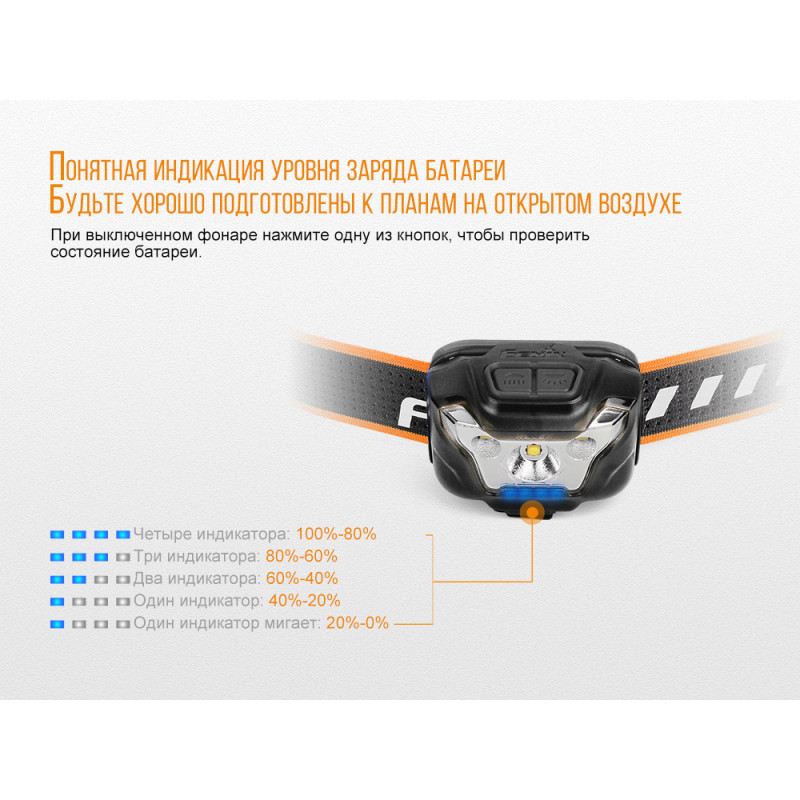 Для моделі Fenix HL18R передбачена функція індикації заряду. Діоди індикатора розташовані на передній стороні корпусу ліхтаря, під центральним світлодіодом. Індикатор розрахований на 5 позицій: