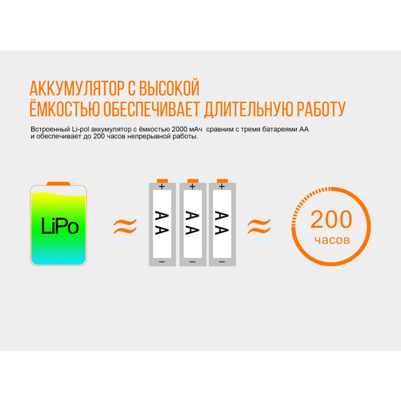 - акумулятор ємністю 2000 маг вбудований в корпус ліхтаря;