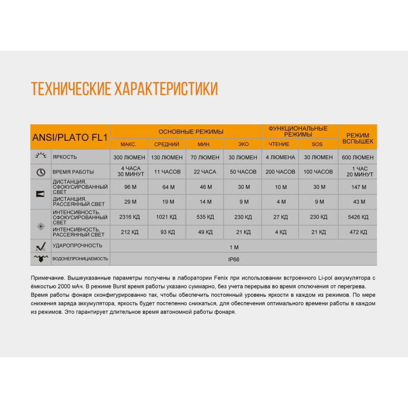 Яскравість | 300 люмен | 130 люмен | 70 люмен | 30 люмен | 4 люмена | 30 люмен | 600 люмен | |