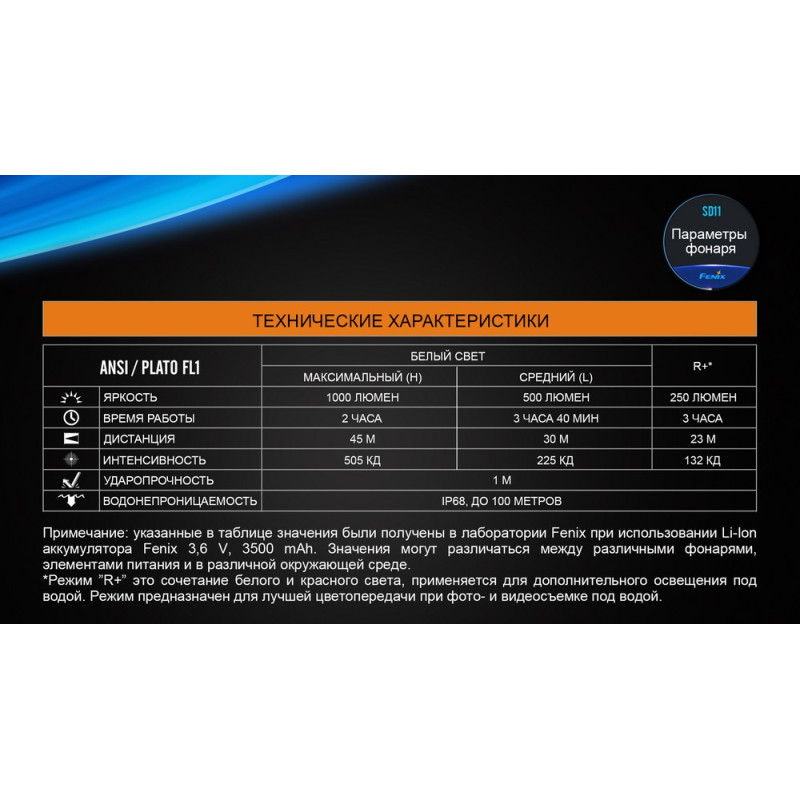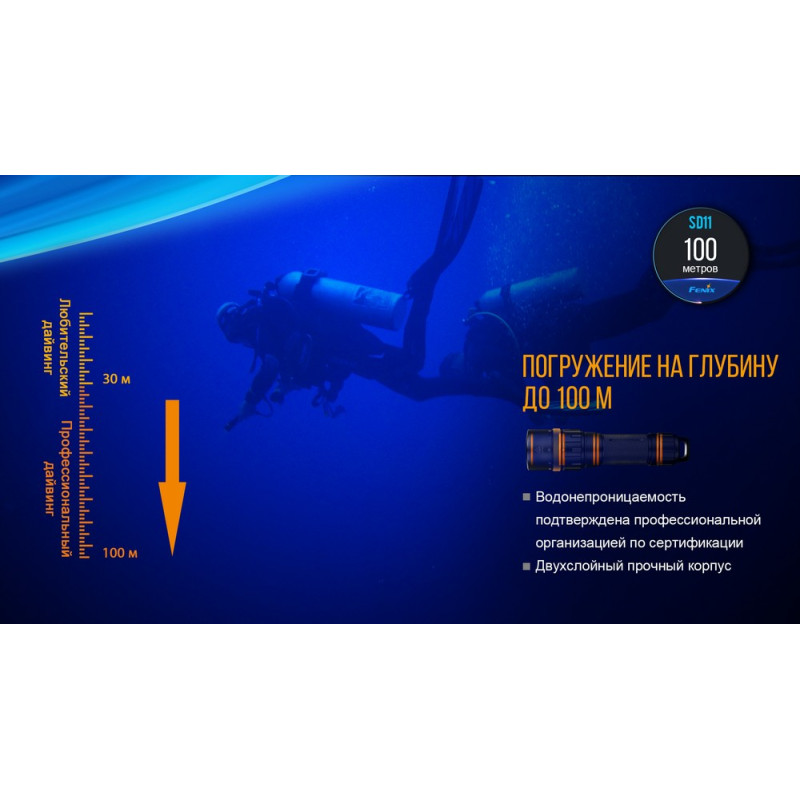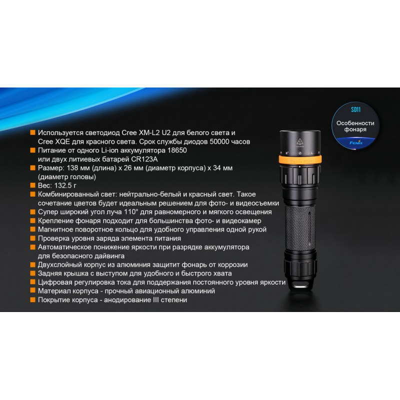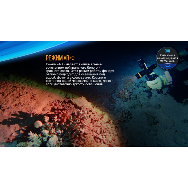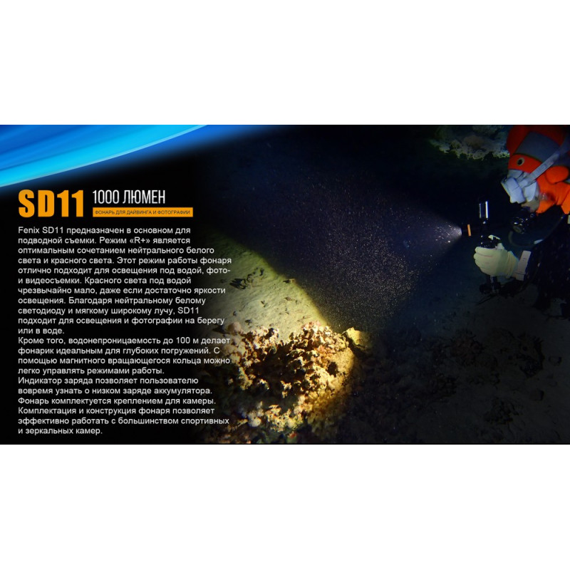 Компанія Fenix презентувала особливий ліхтар для дайвінгу, яка особливо припаде до душі любителям підводної фотографії і відеозйомки. Це модель SD11, в якій встановлені відразу два діоди: червоний і нейтрально-білий. Такий ліхтар висвітлює широкий простір під кутом 110°, даючи м'яке світло, приємний для очей і ефективний у воді. Ліхтар працює в трьох режимах з такими властивостями: