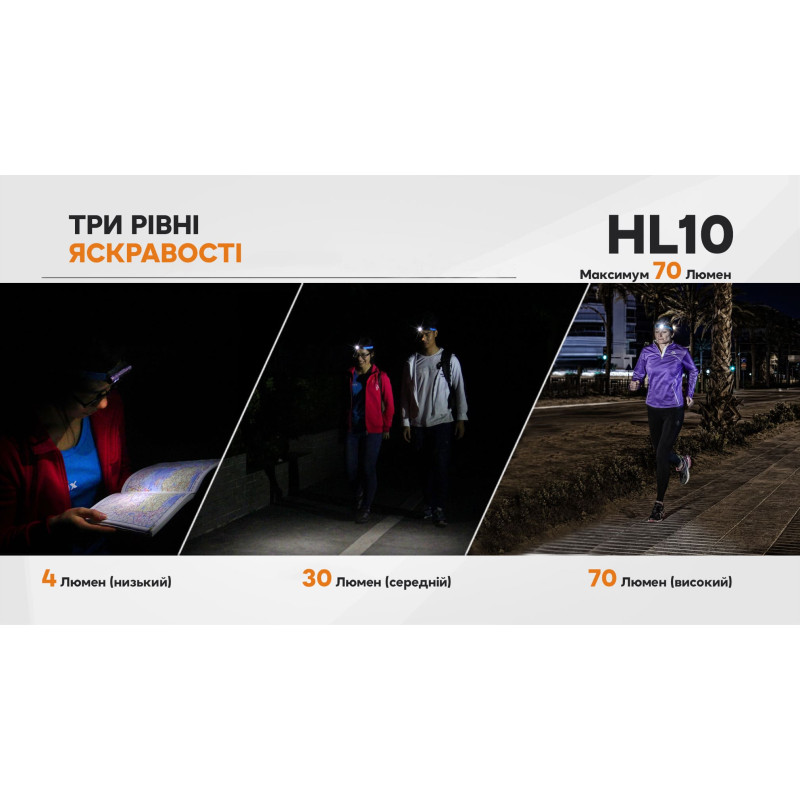 Fenix HL10 - це сучасний і зручний ліхтар з можливістю кріплення на голові свого власника. Межа яскравості для нього встановлений на рівні 70 люмен і цього достатньо, щоб добре бачити дорогу на відстані 30 метрів. Ліхтар працює в трьох режимах (додаткові рівні яскравості — 30 і 4 люмена). Він оснащений лінзою з двома типами поверхні: гладкою і текстурованою. Залежно від того, потрібен вам сфокусований промінь або заливний світло, досить лише повернути лінзу потрібною стороною. В даному ліхтарі встановлений довговічний діод, який не втрачає своєї яскравості протягом 50 тисяч годин роботи.