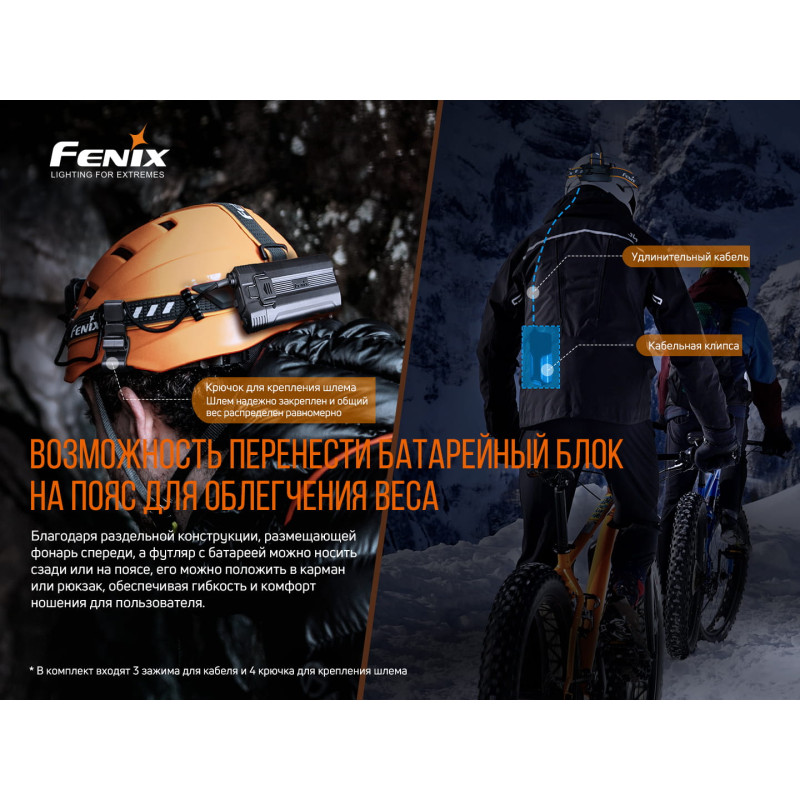 Комплектація | Ліхтар, 2 акумулятора Fenix ARB-L21-5000 Li-ion, USB Type-C кабель для зарядки, 4 гачки для кріплення на шолом, 3 кліпси для кабелю, кріплення для ременя з нержавіючої сталі, подовжувальний кабель, запасне кільце ущільнювача, інструкція, гарантійний талон. | ||||||||||
