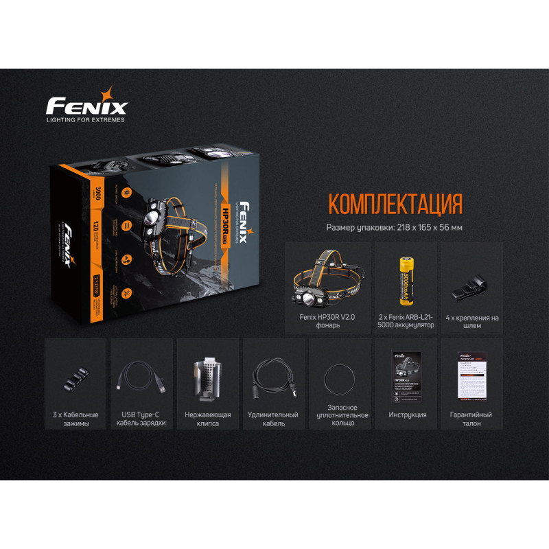 Ліхтар моделі Fenix HP30R V2.0; два літій-іонних акумулятора Fenix ARB-L21-5000; кабель для зарядки USB Type-C; чотири гачки для кріплення до шолома; три кліпси для кабеля; кріплення для ременя з нержавіючої сталі; подовжувальний кабель; запасне ущільнювальне кільце; керівництво користувача; талон гарантії.