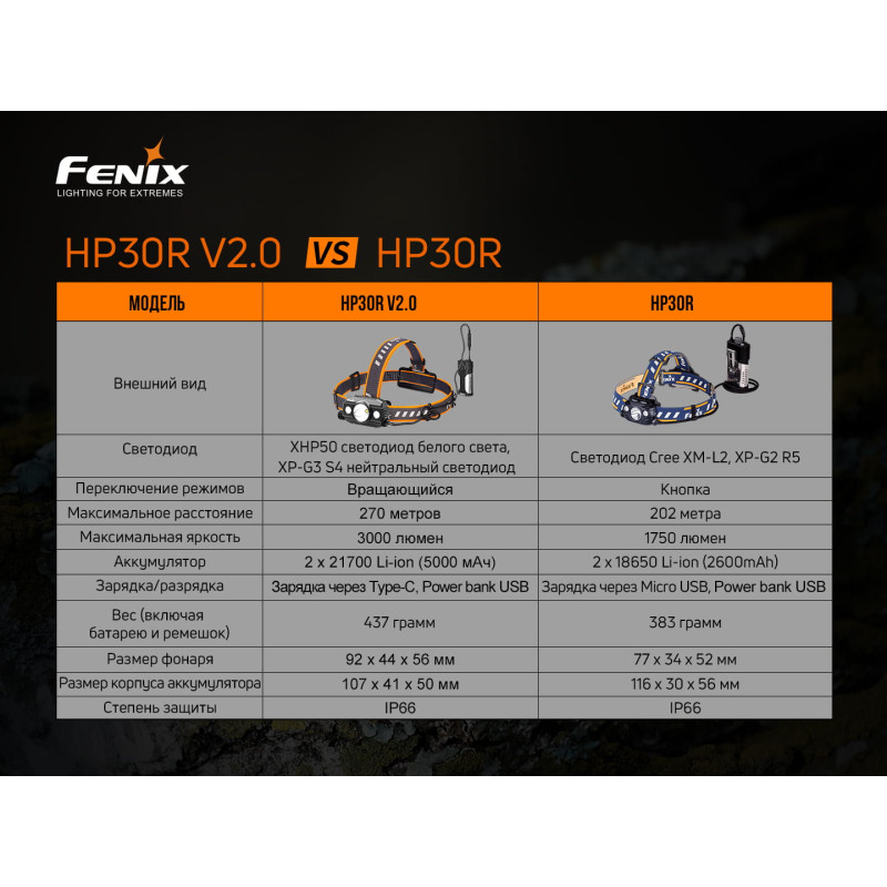 Модель ліхтаря Fenix HP30R V2. 0 являє собою надвисокопродуктивний налобник. Він може застосовуватися в пошуково-рятувальних операціях, також підійде в якості прекрасного помічника для любителів активного дозвілля. Це оновлена версія ліхтаря Fenix HP30R, випущеного раніше. Перезаряджається налобник дає відмінну яскравість світла в 3000 люменів з відстанню дії 270 метрів. Для роботи задіюються відразу три світлодіода: один діод білого освітлення XHP50, два світлодіода нейтрального білого освітлення XP-G3 S4, з терміном експлуатації 50 тисяч годин.