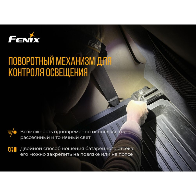 Особливість цього ліхтаря-здатність синхронно задіяти як розсіяне, так і сконцентроване освітлення. Тим самим виходить адаптується світло. Для запуску режиму БЛИЖНЬОГО-ДАЛЬНЬОГО світла є поворотний перемикач. Подвійний інтерфейс для зарядки і розрядки. Подвійний спосіб носіння батарейного відсіку: його можна закріпити на пов'язці або на поясі.