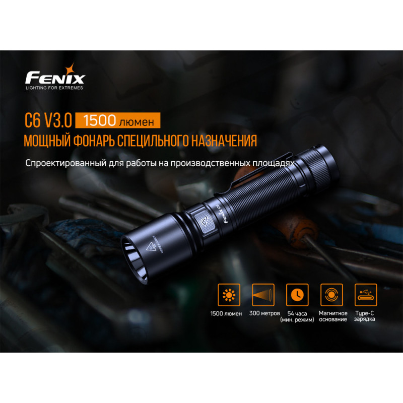 Ліхтар моделі Fenix C6V3.0 це невеликий ручний прилад, дає максимальний світловий потік до 1500 люменів. При цьому найбільша дистанція освітлення досягає 300 метрів. Функціонує на світлодіоді Luminus SST40, термін служби якого становить 50 тисяч годин. Живиться ліхтар за рахунок літій-іонного акумулятора 18650 ємністю 2600 мА*ч.заряджається за допомогою USB Type-C, зарядний струм – 2 ампера. Для того, щоб повністю зарядити модель, вам знадобиться дві години часу.