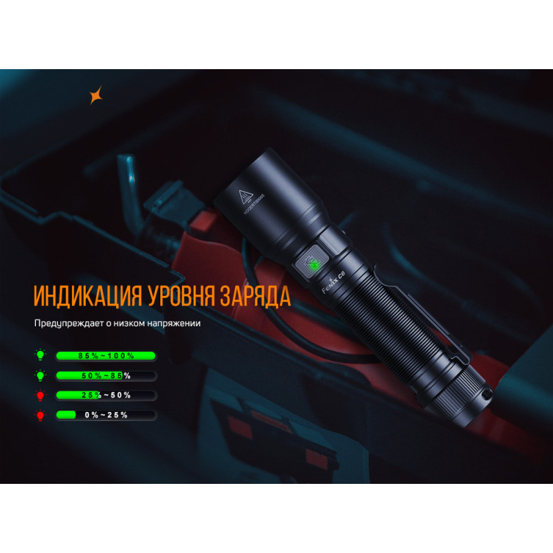 Комплектація: ліхтар моделі Fenix C6V3.0, ARB-L18-2600 Li-ion акумулятор, USB Type-C кабель зарядки, ремінець на руку, кільце ущільнювача, інструкція до застосування, картка гарантії.