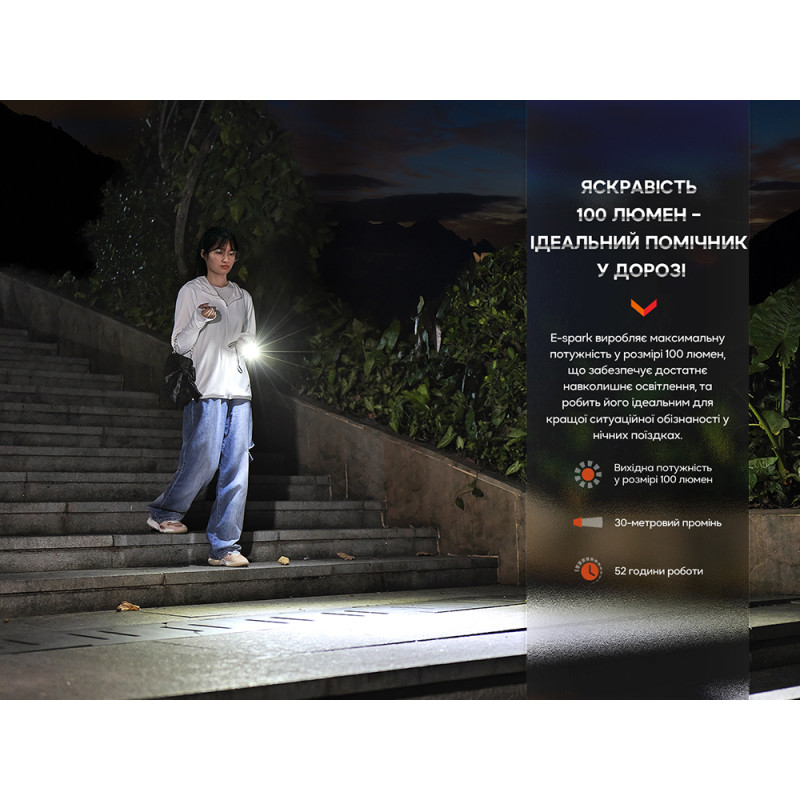 Fenix E-Spark є акумуляторним ліхтарем-брелоком для аварійних ситуацій. Fenix E-SPARK — ліхтар, що перезаряджається, на брелоку з функцією Power Bank. За рахунок вбудованого акумулятора ємністю 800 мАг він гарантує яскравість світла 100 люменів, далекобійність променя становить 30 метрів.