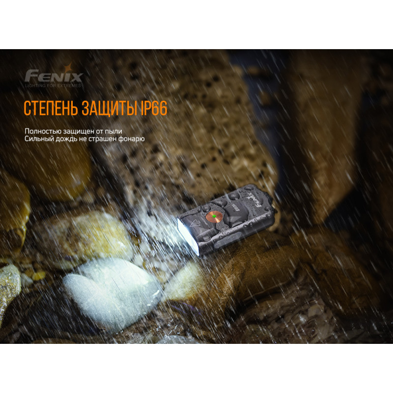 Модель добре захищена від пошкоджень при використанні. Зрозуміло, що на практиці можуть бути різні випадки, і брелок може впасти, ушкодитися, намочиться і так далі. Але що до Fenix E03R, то він має стандарт захисту IP66. Що значить – виріб в змозі переносити потужний струмінь води, яка на нього потрапить, і при цьому не вийти з ладу. Також воно добре протистоїть забруднення. Така висока ступінь захищеності гарантує тривалу експлуатацію і надійність ліхтаря. Досить міцний, стійкий до зносу і механічних впливів.