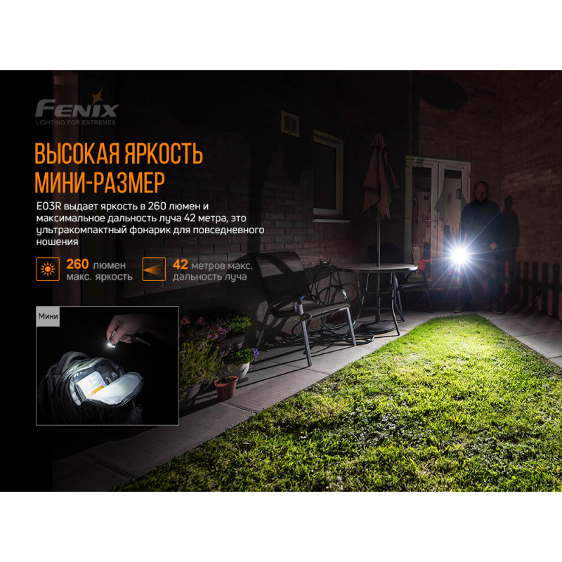 Що стосується ліхтарі Fenix E03R, то він стане правильним вибором в ролі невеликого подарунка. Володіє красивим дизайном, легко управляється, має клас захисту IP66. Підтримує зарядку через USB Type-C.
