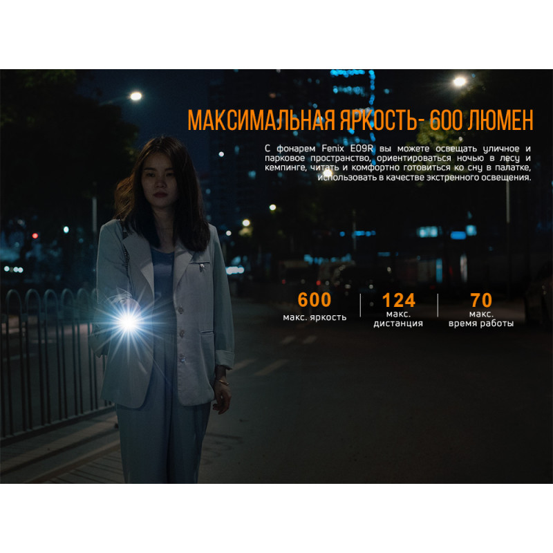 Модель Fenix E09R являє собою невеликий за розмірами і легкий брелок, який забезпечує освітлення яскравістю до 600 люменів. При цьому далекобійність променя становить 124 метри. Функціонує модель на світлодіоді Luminus SST20, а елементом живлення є вбудований Li-Po акумулятор 800 маг. Термін служби такого світлодіода досягає 50 тисяч годин.
