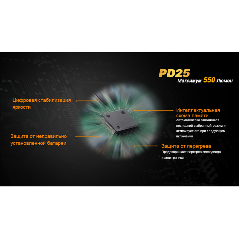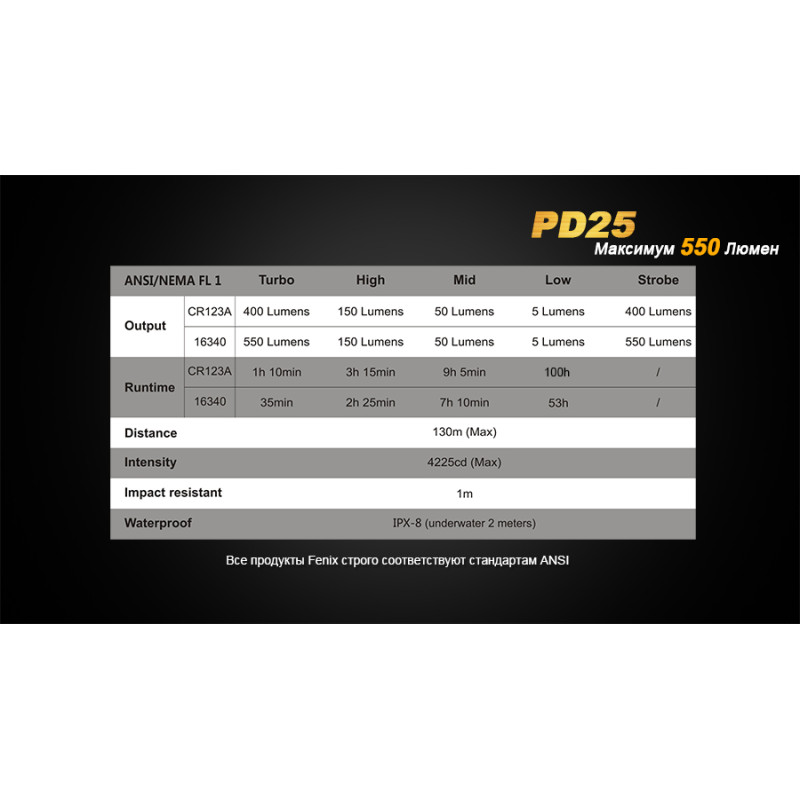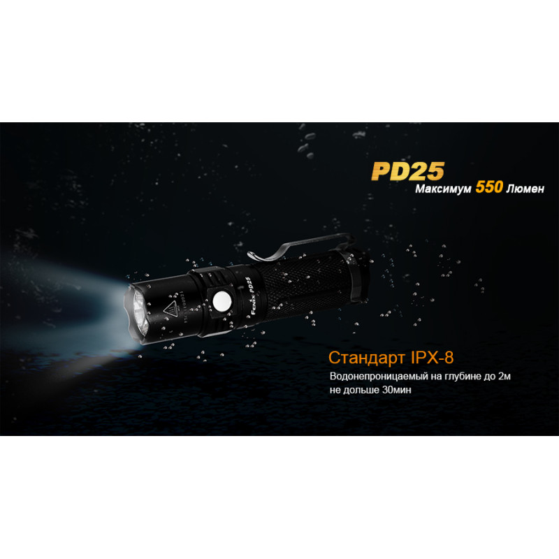 Завдяки невеликим розмірам, ліхтар Fenix PD25 легко поміщається в кишені. А високий рівень міцності дозволяє не турбуватися про його працездатності в заміських умовах. Механізми ліхтаря захищені від перегріву, виникнення короткого замикання. Яскравість світла в обраному режимі підтримується спеціальним драйвером на постійному рівні, а про те, що заряд акумулятора вичерпаний, попередить вбудований індикатор. На механічному рівні модель Fenix PD25 також добре захищена. Корпус для ліхтаря зроблений з металу з анодуванням поверхні, його деталі щільно підігнані один до одного. Fenix PD25 відповідає вимогам, які висуває міжнародний стандарт IPX-8. Він передбачає, що ліхтар не вийде з ладу після падіння з висоти 1 м на камені та продовжує справно працювати після занурення на півгодини на 2 м під воду.